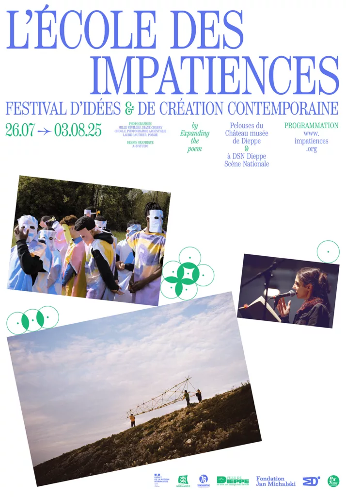 The School of Impatiences is a multidisciplinary biennial event that focuses on debates, contemporary thought, visual arts, literature, and poetry. It is a school without walls, open to all, based in Dieppe, Normandy. Through various formats of encounters (conferences, workshops, performances), the aim is to collectively shape the world to come, based on our social, ecological, and political impatiences, accompanied by the thinking of artists, researchers, and writers.